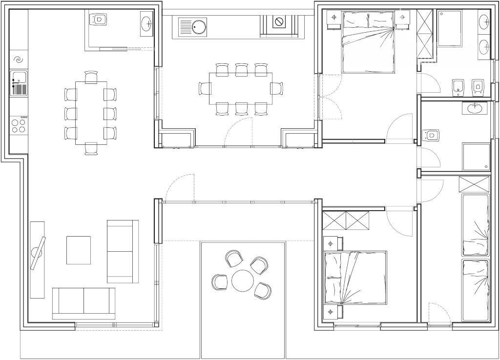 This home features an entrance area that divides the space into a living area and a sleeping area. The living section includes a large kitchen that opens to the living room, along with a separate toilet. A glazed corridor, which allows ample daylight and sunshine to fill the house, leads to the sleeping area. Here, you will find three bedrooms: a master bedroom with its bathroom and two additional bedrooms that share a common bathroom.