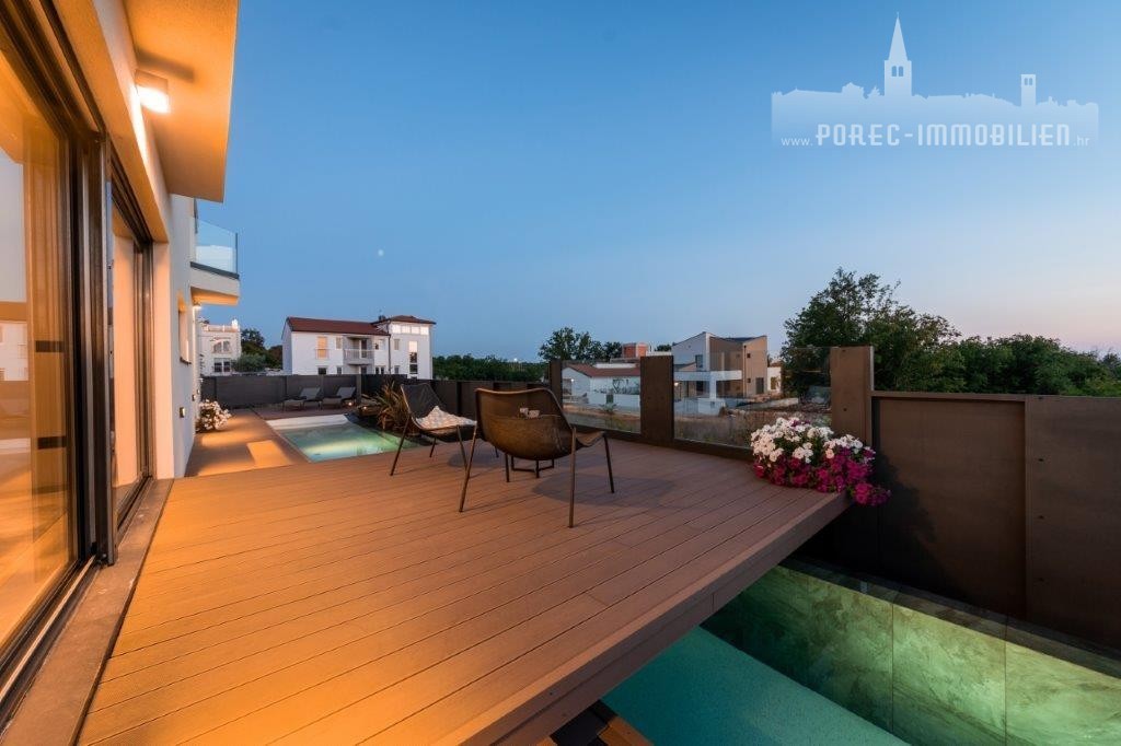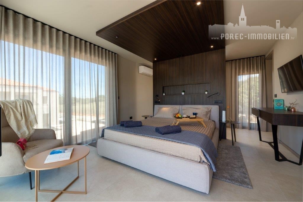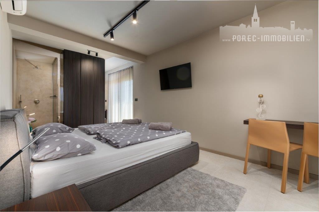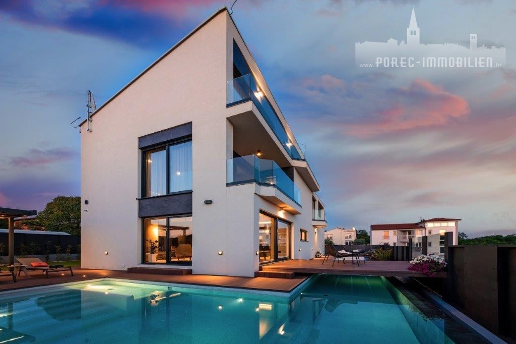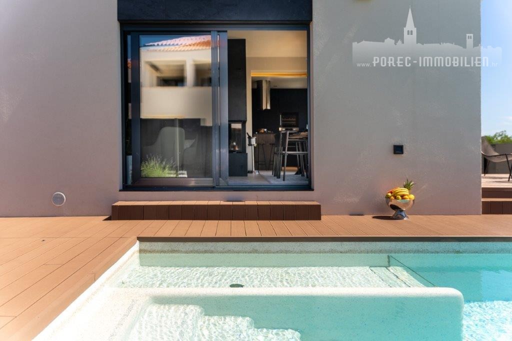 A modern semi-detached villa with a sea view is for sale, not far from the center of Poreč and its beautiful beaches.