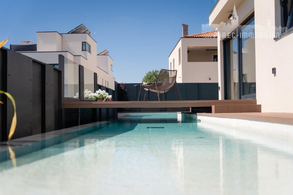 On the beautifully landscaped garden with automatic irrigation, there is a heated infinity pool of 50 m2, a covered terrace with a barbecue, and a dining place.