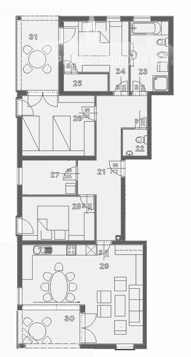 The apartment features a functional layout that includes a hallway connecting all the rooms. It consists of three bedrooms; two of which have access to a terrace, a kitchen, an open-plan living room with a dining area that adds to the space's spaciousness and brightness, a study (which can also serve as an additional bedroom), a bathroom, and a guest toilet.