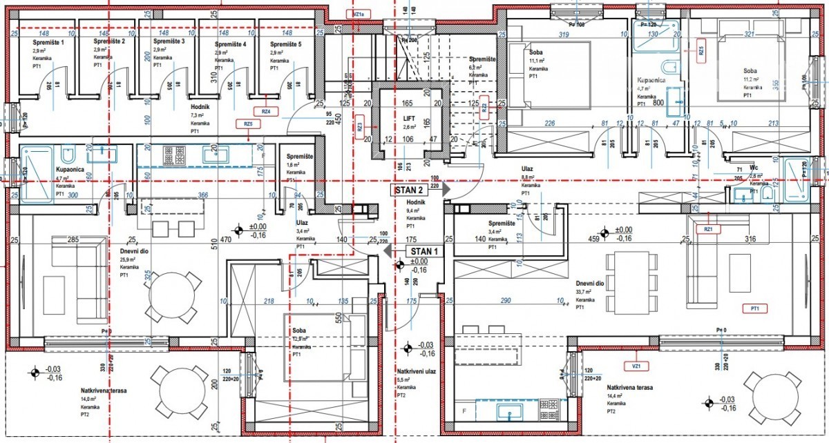 Apartment 2 is situated on the ground floor, has a net area of 88.9 m2, and consists of a hallway, an open-plan living room, dining area and kitchen, two bedrooms, a bathroom, a guest toilet, and a storage room.
