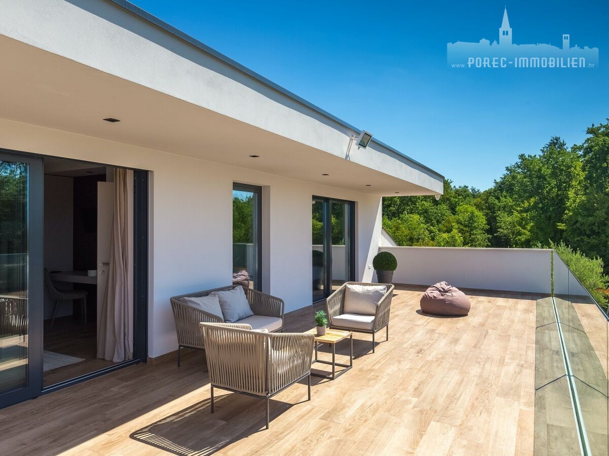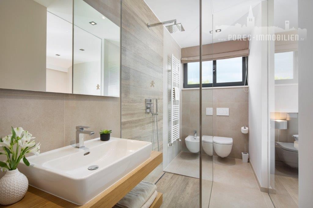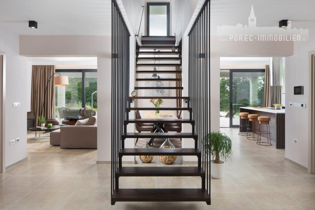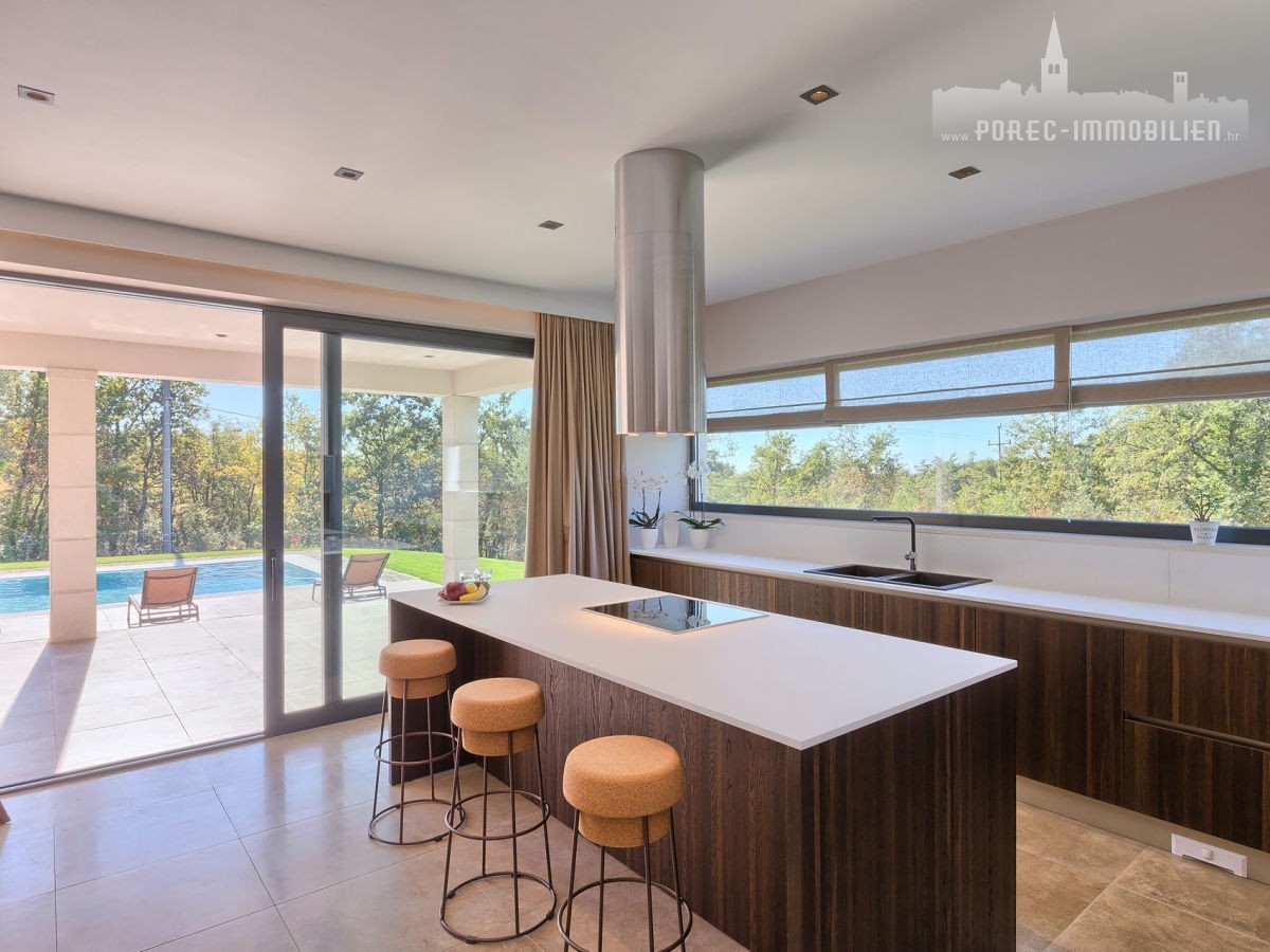 Zahvaljujući velikim staklenim stijenama, dnevni boravak i kuhinja su izravno povezani s pomno osmišljenim vanjskim prostorom koji uključuje veliku terasu s grijanim bazenom od 50m2 sa 2 hidromasažne ležaljke, veliko sunčalište, vanjsku kuhinju i blagovaonicu, lounge kutak, spremište od 12 m2 te prekrasan vrt sa automatskim navodnjavanjem oplemenjen mediteranskim biljem, što ovaj prostor čini idealnim za zabavu, druženje i opuštanje.