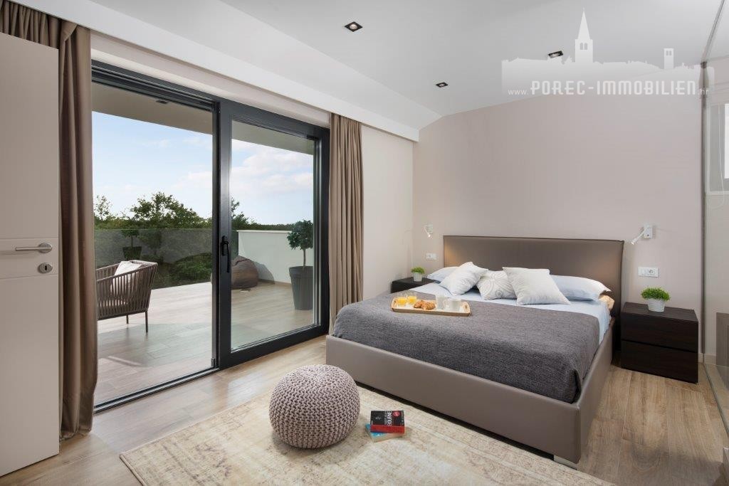 Unutarnje stepenište vodi na gornji kat vile na kojem se nalaze dvije spavaće sobe sa kupaonicama i izlazom na djelomično natkrivenu terasu sa koje se pruža prekrasan pogled na netaknutu prirodu.