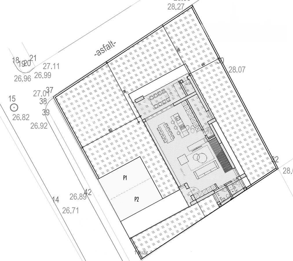 Sul terreno sarà la piscina di 35 mq, il ripostiglio esterno, l'irrigazione automatica, due posti auto e per la maggiore sicurezza sarà installato il sistema di allarme e la videosorveglianza.