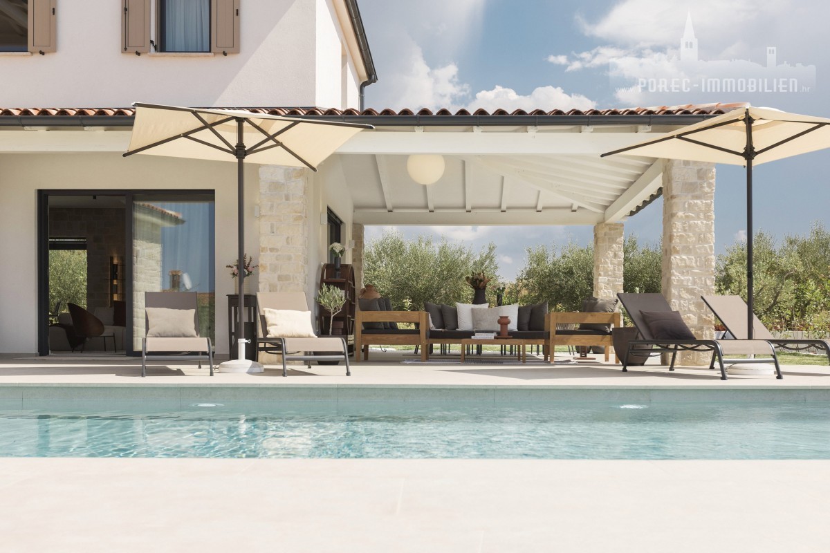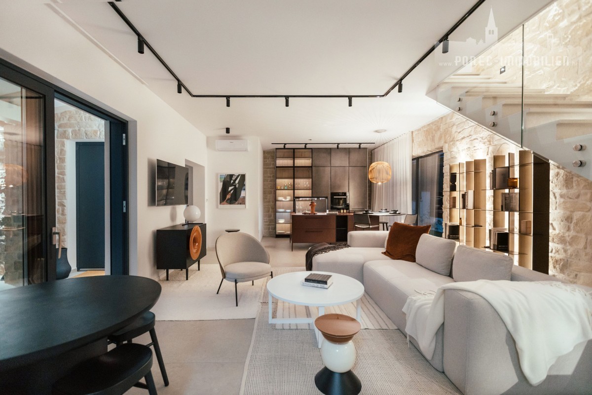 In una tranquilla località, vicino alle spiagge e al centro di Parenzo, è in vendita una villa esclusiva che combina perfettamente design tradizionale e moderno.