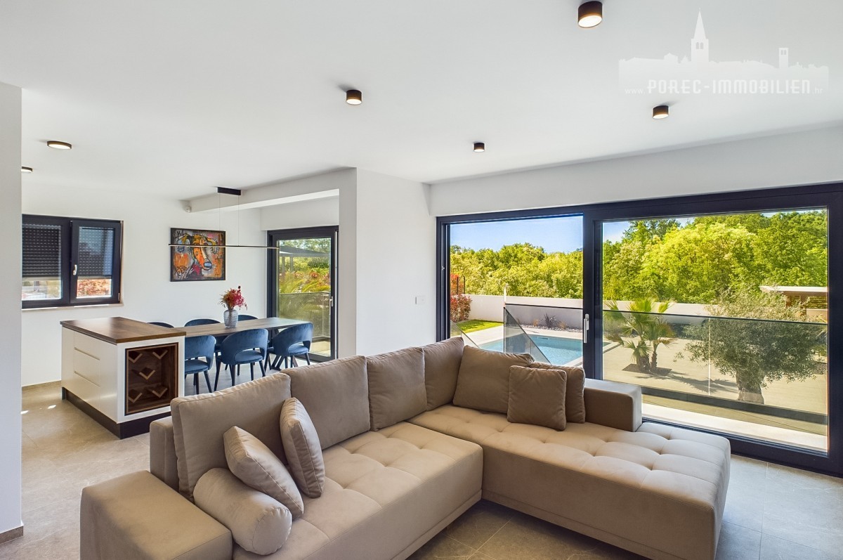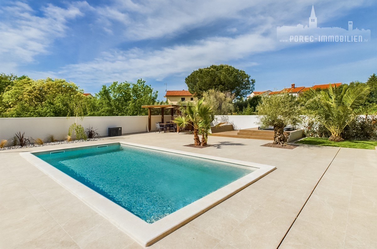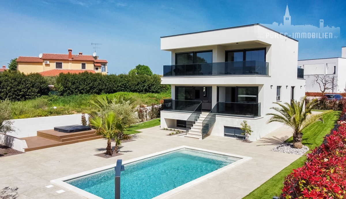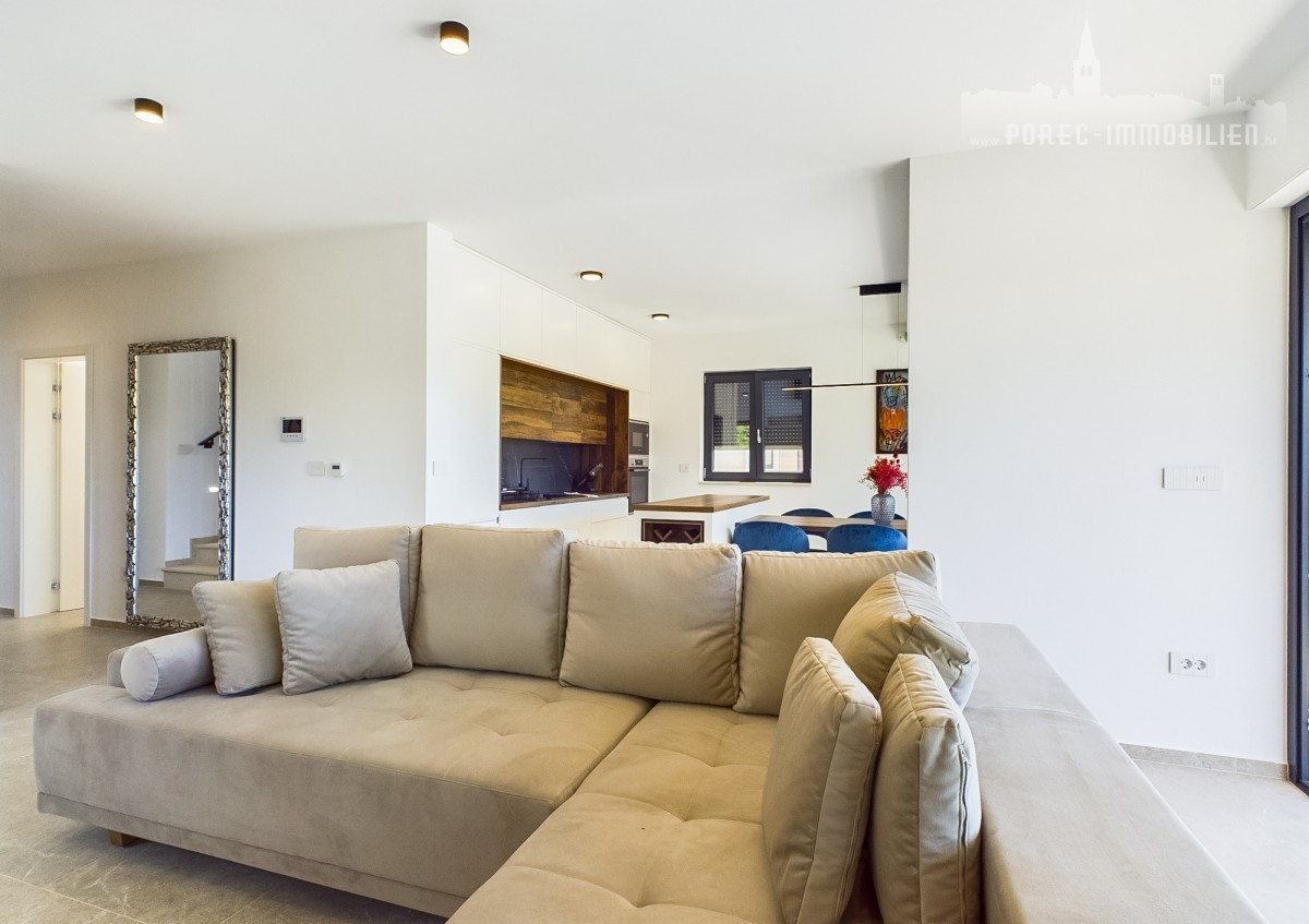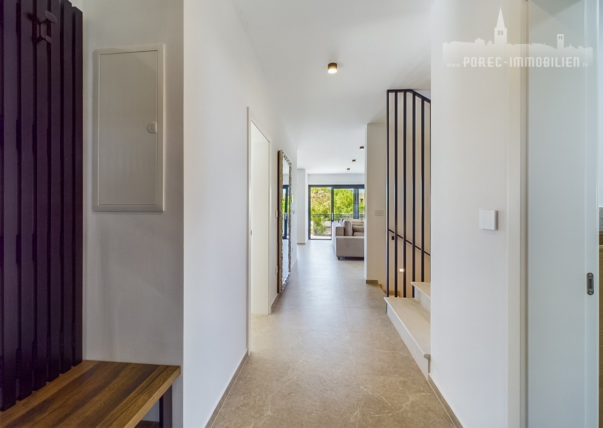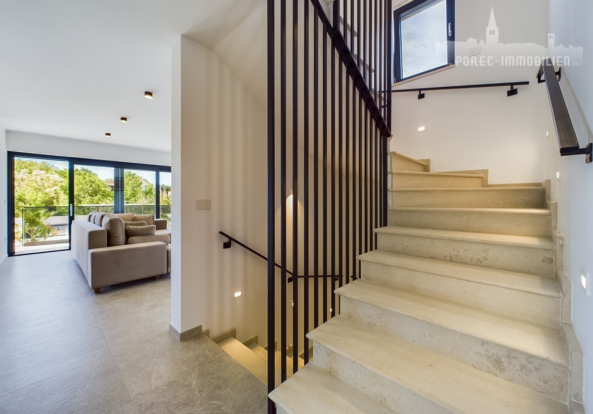 Vendesi la villa moderna situata a Parenzo, a soli 2 km dal mare. La proprietà offre la superficie netta di 217,43 m2 e dispone di una vista mozzafiato sui rigogliosi dintorni. Si compone di seminterrato, piano terra e primo piano e si trova su un terreno di 707 mq.