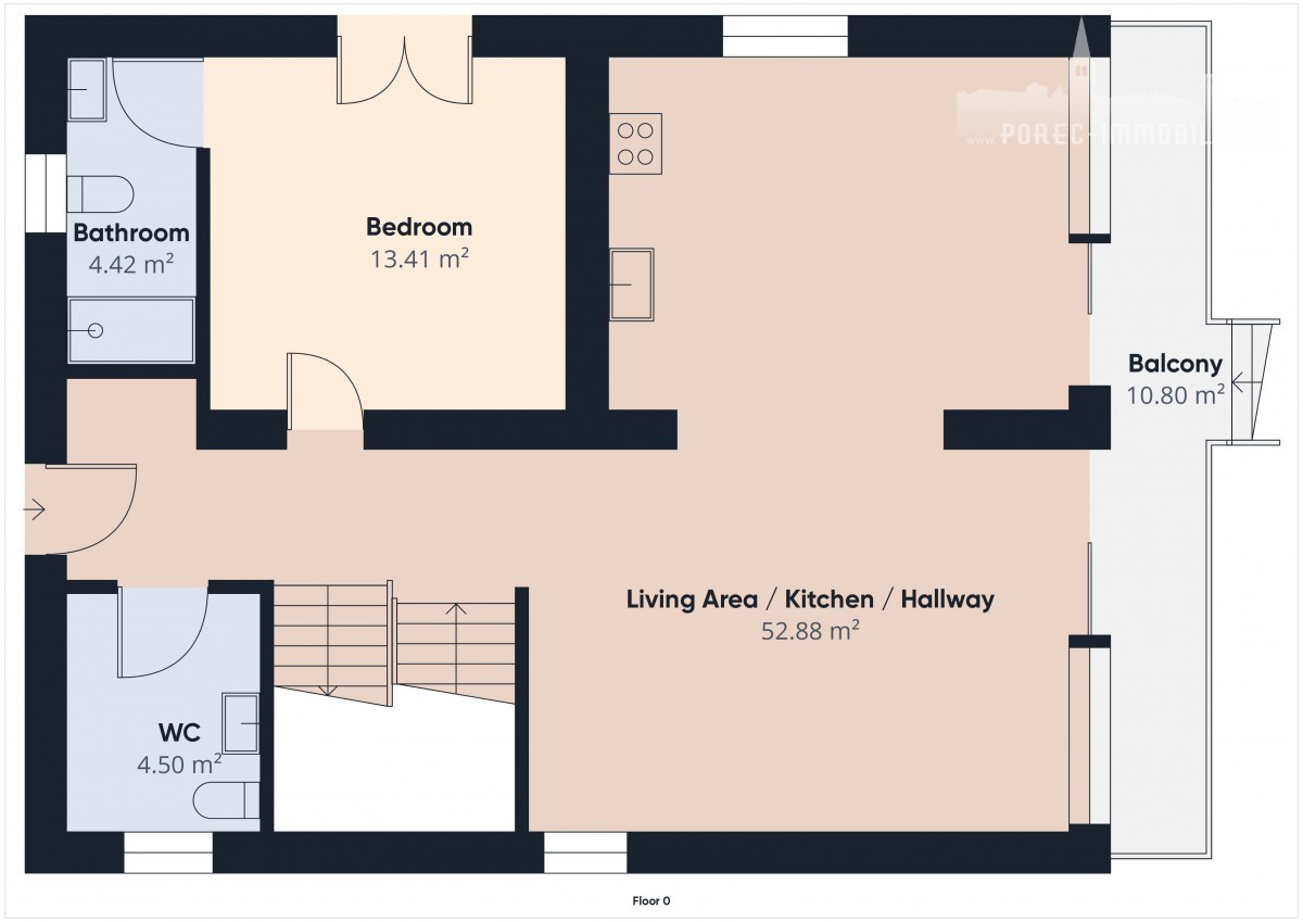 Il piano seminterrato è composto dall'ampio open space con la palestra, i servizi benessere con la sauna e la doccia, il bagno e il locale tecnico. La scala interna in pietra istriana conduce al piano terra. Questo livello contiene l'ingresso, il bagno, la cucina con la isola mobile, la zona pranzo, il soggiorno a pianta aperta e la camera da letto con il bagno privato.